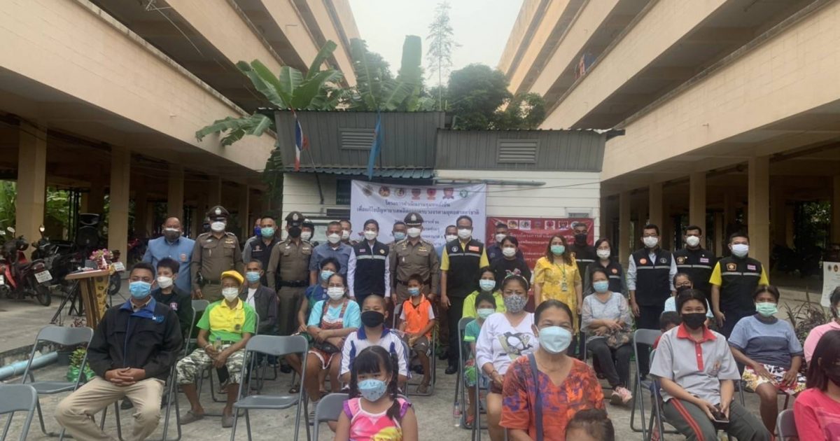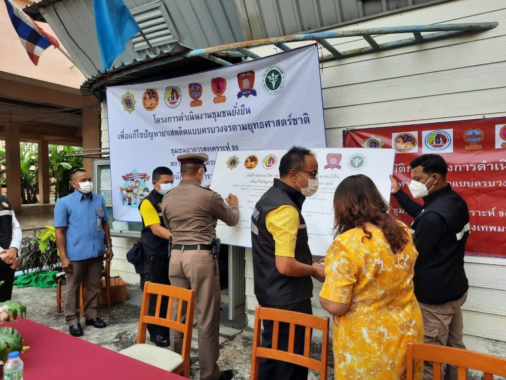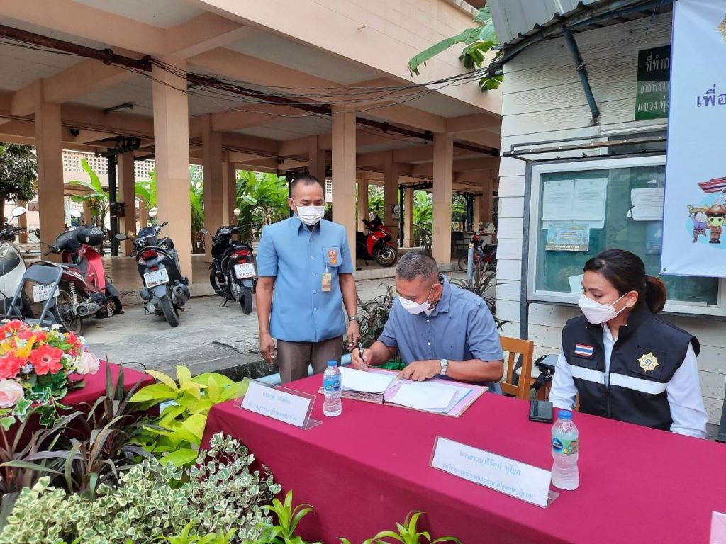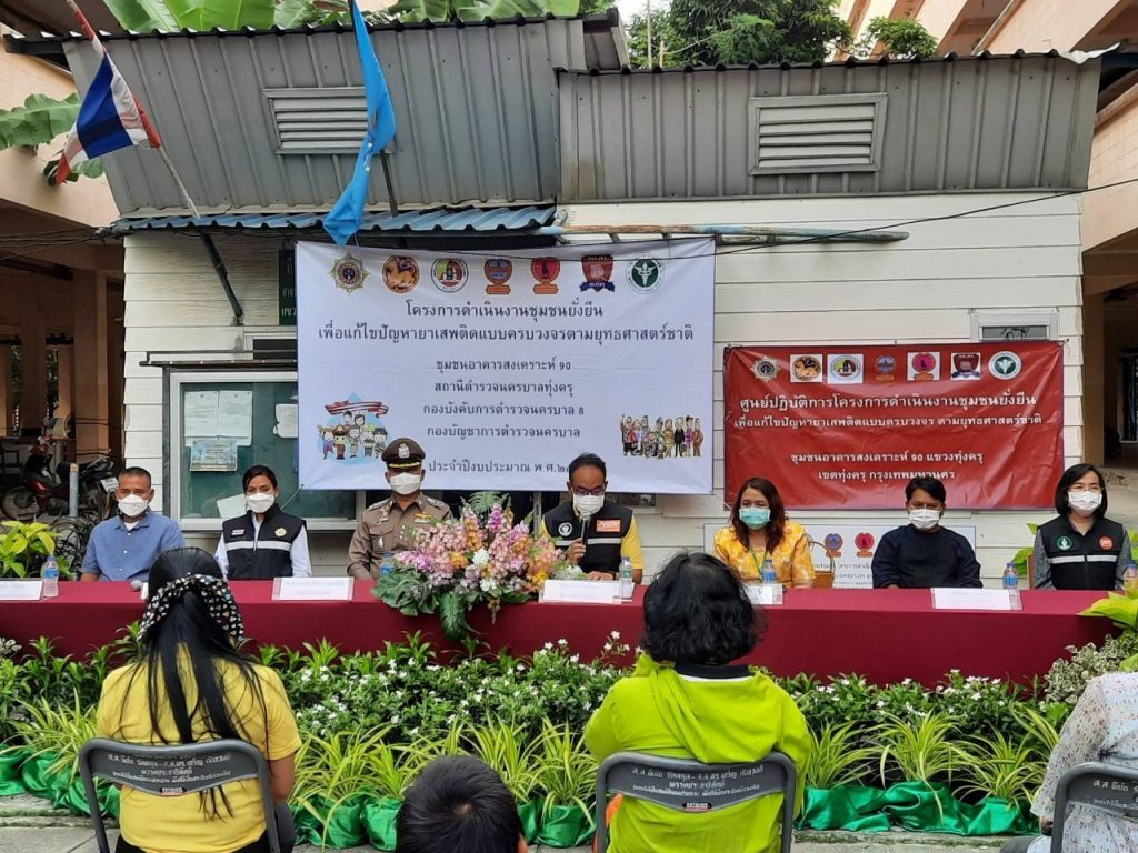 วันที่ 11 ก.พ.65 เวลา 16.00 น. พ.ต.อ.อนันต์ชัย กมลรัตน์ ผกก.สน.ทุ่งครุ นายณรงค์ ตาปสนันทน์ ผู้อำนวยการเขตทุ่งครุ นางผาสุก ชาญชัยเชาว์วิวัฒน์ ผู้ช่วยสำนักงานเขตทุ่งครุ นายอนุชิต สาสกุล หัวหน้าฝ่ายพัฒนาชุมชนเขตทุ่งครุ นางสาวนารีรัตน์ นุโยค ผู้แทนสำนังานปปส.กทม.พ.ญ.กฤชยา มาคา นายแพทย์ขำนาญการพิเศษ นายกฤษดา ทอนสูงเนิน ปนะธานกต.ตร.สน.ทุ่งครุพร้อมคณะต.ตร. นายอรุณ แก้วเอียด ประธานชุมชนอาคารสงเคราะห์กทม.90 พ.ต.ท.อาคม สยามนันทกุล รองผกก.ป., พ.ต.ท.สัมศักด์ ใหม่บุญมี รองผกก.สส., พ.ต.ต.สมหมาย แก้วมณี สวป, พ.ต.ต.สุมิตร นานนท์ สว.จร.,เจ้าหน้าที่ตำรวจ2-0สายตรวจ, สายตรวจ จยย. ,เจ้าหน้าที่ฝ่ายสืบสวน ,เจ้าหน้าที่ชุดปฏิบัติการชุมชนยั่งยืน ฯ ,เจ้าหน้าที่ ตชส., อาสาสมัครตำรวจ, ผู้แทนฝ่ายพัฒนาชุมชนเขตทุ่งครุ, กรรมการชุมชน,และ ประชาชนชุมชนอาคารสงเคราะห์90 (ธง)ร่วมพิธีเปิดโครงการชุมชนยั่งยืนเพื่อแก้ไขปัญหายาเสพติดแบบครบวงจร ตามยุทธศาสตร์ชาติ ประจำปีงบประมาณ 2565 พร้อมร่วมกันลงนามทำMOUร่วมกัน ณ อาคารที่ทำการชุมชนอาคารสงเคราัห์90 โดยมีนายณรงค์ ตาปนันทน์ ผู้อำนวยการเขตทุ่งครุเป็นประธานทั้งนี้ ได้ปฏิบัติตามมาตรการป้องกันโรคระบาดโควิด 19 อย่างเคร่งครัด